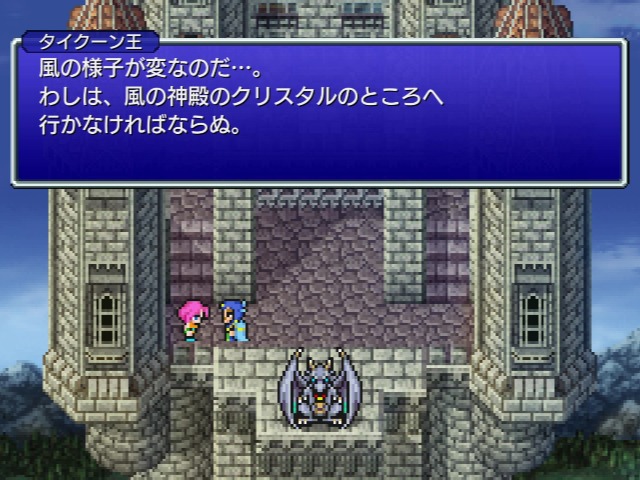 タイクーン王の「タイクーン」は英語では「Tycoon」で、ズバリ日本語の「大君」からきた英単語なので、チゲ鍋やフラダンスぐらい意味が被っています。それでこの王様は「風の様子が変なのだ…。」ってことで風の神殿に赴く必要があるようです。こんなヘリポートもない屋上から出かけるっていうんですから、交通機関はもちろん飛竜ですよね。したがってタイクーン王に竜騎士属性の可能性がでてきます。レナ姫は王が一人で出かけることを心配してるようです。そして風の異変に姫もお気づきのようです。風・・・ドラゴン乗りの血なのか、はたまた王家の何かなのか、風がキーワードとなっているようです。行き先の神殿には例によってクリスタルがあるそうなので、風のクリスタルなんでしょう。土、風、火、水のうち今回のトップバッターは風です!FF4では風のバルバリシアが3番手でしたっけ。