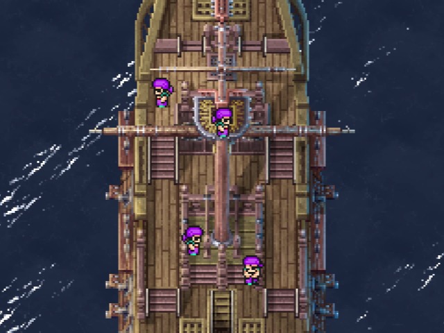 場面はかわって、海上です。あの眼帯とバンダナからいかにも海賊であろう風体の男たちが船を走行させています。潮の感じがドット絵なのにちょっとリアルです。これがスーパーファミコンに乗ってた!?いや、ピクセルリマスター版の成果かな?