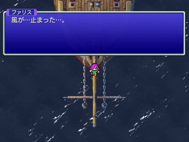 カメラが下方向に下がっていくと舳先の上に紫の髪の長髪男子が「風が…止まった…。」とか言いながら飛び乗りました。なんかレナ姫に続いて、髪の色がド派手ですね、FF5。男の名前はファリスで、一人船内労務をサボっているので船長的な役割だと想像されます。船乗りの端くれでしょうから「風」が凪いだことには敏感そうですが、この雰囲気だと風の神殿での問題と関わってきそうでもあります。まぁ、チラッと顔出しだけで、すぐどうこうなるわけでもなさそうです。・・・っていうかファリスは今作の主人公ではないですよね。まだでてこない主役に少し不安になってきました。そして、次の画面でも主人公はお預けを食うのでした。