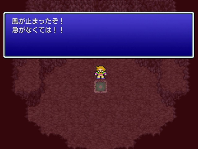 続いて赤い洞窟のような場所でおじさんも風が止まったことに気づいたようです。いや、髭ってだけでおじさんじゃないかもしれませんが、FFで若者は髭を蓄えない気がします、これまで通りなら。洞窟はガタガタ振動しているので崩落しそうです。これは風のクリスタルの影響で土の方も何か起きてる信号でしょうか?あっ、レナ姫やファリス船長はセリフに「名前」が明示されていたんですが、このおっさん(仮)は名前が出てないですね。隠されているのか、それとも単独行動だから名前が呼ばれてないっていうだけでしょうか。