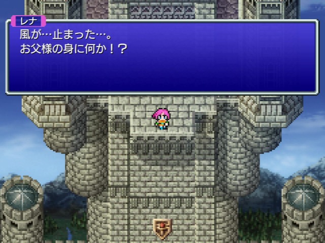 舞台はまたタイクーン王国に戻ってきました。レナ姫もまた風の停止を感じ、父親の安否を気にかけています。風が止まるのがそんなに珍しいのでしょうか。ここは風の谷?ムシゴヤシが午後の胞子を飛ばしてくるの?そういわれてみれば、姫様のいでたちにちょっとナウシカ味が無きにしも非ず?姫も空を飛ぶんでしょうか、メーヴェ的な何かで。ここは父親を継いで竜騎士候補ですね。あの髭の男はユパ様で・・・あっ、その発想で行くとタイクーン王、殺されちゃうか。