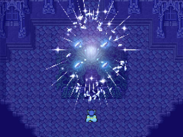 そのタイクーン王ですが、どうやら風の神殿に到着したようです。いつものクリスタルの部屋で王がみたものは・・・光を失っていくクリスタルが・・・爆散するシーンでした。もう、5作目ですからね、クリスタルも初手で粉々になるってもんです。手を変え品を変え、クリスタルもただ集めればいいアイテムではなくなるのでした。FF4は土水火風の4つが倍増しましたよね~。大体、クリスタルは一個ダメになるとバランスが崩れて、全体的に世界ごと悪くなっていくんですよね。これは大変。多分、タイクーン王国の領内なので、王様が危険物取扱責任者みたいな役割なんでしょう。