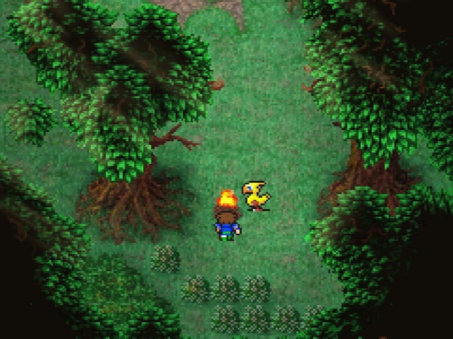 ここでやっとチョコボとその相棒が登場です。森の中で獣に襲われないように焚火して休憩中でしょうか。それにしても、このチョコボ、火に慣れすぎでしょう。世の中にはいろんなチョコボがいるので、このくらいではもう驚かないか。