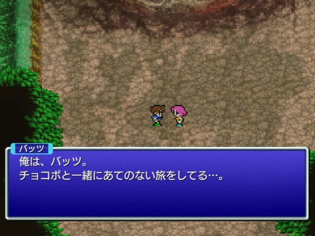倒れていたレナ姫を助け起こすと、感謝され、自己紹介タイムです。ついに主人公の名前バッツが露出しました。バッツ・・・聞いたことがあったようななかったような。真っ先に連想したのはサンリオのバッドばつ丸でした。バッツはチョコボのボコとあてのない旅をしてるそうです。これが世にいう風来坊でしょうか?漫画ではフラフラ町々を訪れるキャラクターがいたりしますが、あーいう人たちがどうやって生計を立ているのか不思議でなりません。引く手あまたの超絶技巧を持っていて食いっぱぐれないか、犯罪や暴力で渡世してる感じでしょうか?コンビニのバイトとかはさすがに定住証明くらい求められますよね。ちなみにここで全角6文字、半角12文字まで別名をつけられそうでした。名前は多分バイト数制限とかじゃなくって、画面表示の都合で決まってるんでしょうね。絵文字を・・・いや、きっとロクなことにならないから余計なことは止めておきましょう。