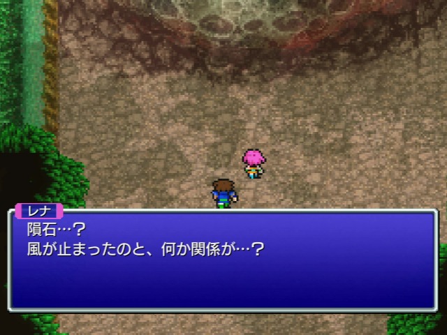 しかし、バッツがスケベ心を出す前に、レナ姫が何かを聞きつけます。「う…助けてくれ…。」か細い声です。辺りを探すとバッツが発声源を聞き当てます。まぁ、この場で助けを求めると言ったら隕石絡みでしょうね。ボコボコした直径何十メートルもありそうな隕石の脇に、先に謎の洞窟に登場していたひげのおじさんが倒れてました。