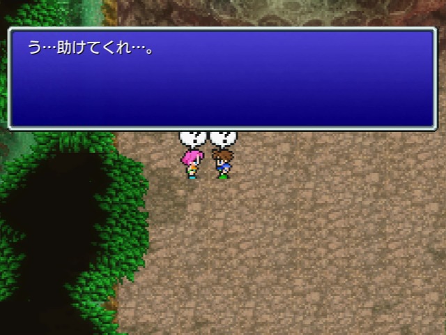 これはダウトでしょう。全部作り話です。彼の演技です。バッツかレナ姫のどっちかに取り入ろうとしているように見えます。彼が思い出したとかいう名前も偽名の可能性があります。吟遊詩人ガライに謝れ!(違う)こうして風来坊・バッツ、お父さんっ子・レナ姫、都合のいい記憶喪失ガラフが出会ってしまったのでした。えっと確かもう一人、ファリスでしたっけ?ロン毛海賊も遠からず出会えるかもしれません。4人パーティーが基本ですもんね、FFも。