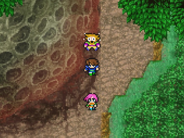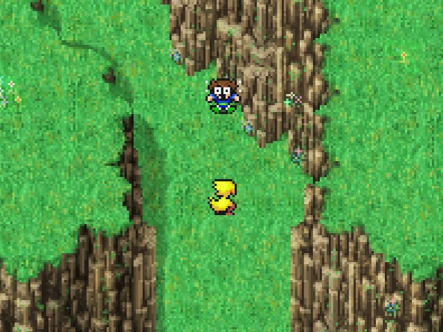 崖に挟まれ狭くなっている地形にさしかかりました。ここで突然、ボコが急停止し、バッツを振り落とします。どうもバッツの様子がおかしいことに、ボコなりに気が付いたようで、活を入れようとしたようです。