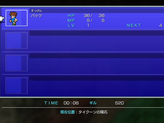 二人を見送ったバッツは、隕石の周りを調査してみましたが、何もありませんでした。こういったものの調査にはいろんな機材や試薬が必要なもんです。専門家に任せるとしましょう。一人になったので改めてステータス画面を開いてみました。レベル1のすっぴんですね。ブロードソードに皮の盾装備中。特に何もないので元来た道を戻ってボコと合流します。ボコと焚き火をしていた辺りの森に一度戻って、今度は北の方に向かってみることにしました。
