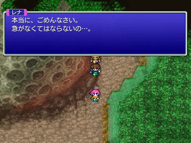 胡散臭い記憶喪失演技の疑いのあるガラフとかいうおっさんは頭を振ったり「?」マークを浮かべたり必死に喪失アピールをしていますが、レナ姫には通じませんでした。「本当に、ごめんなさい。急がなくてはならないの…。」と言い放ち、ゴブリンから救出してくれたバッツも、自称記憶喪失のガラフも置いていく気満々です。何と言っても彼女にはもっと大事なおっさん・タイクーン王パパがいるのでした。どこに行くのかバッツが尋ねると「風の神殿に…。」とレナ姫様。もう早く先を急ぎた過ぎて、返答も「…」で述語を省略し始めました。