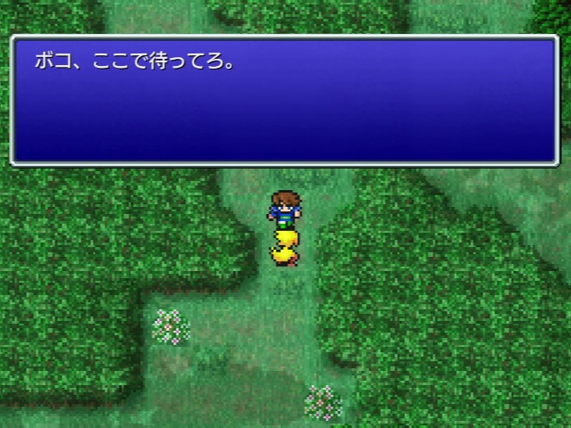 タイクーンの隕石という場所に辿りつきました。正確にはタイクーン領内に落ちら隕石付近の森のようです。「ボコ、ここで待ってろ。」と森の奥の探索は男の子一人で臨むようです。やはり、チョコボのスピードは森では活かせませんもんね。そして、さらっとボコって名前が判明しましたね。チョコボだからボコ・・・ブルドッグにブルちゃんって名付けちゃう感じでしょうか。チョコボの命名にもやはり定番があって、毎年人気ランキングとか統計を取って発表してるんでしょうか?ボコちゃんは・・・残念、10位には入れなそう。デコボコしてそうだし、隣のポコちゃんにかわいい音で負けています。植田まさし先生なら家族との愉快な生活を描き綴ってくれる可能性がありますが、今は旅の途中、皮肉と風刺あふれる相棒との二人旅は疲れてしまいそうです。